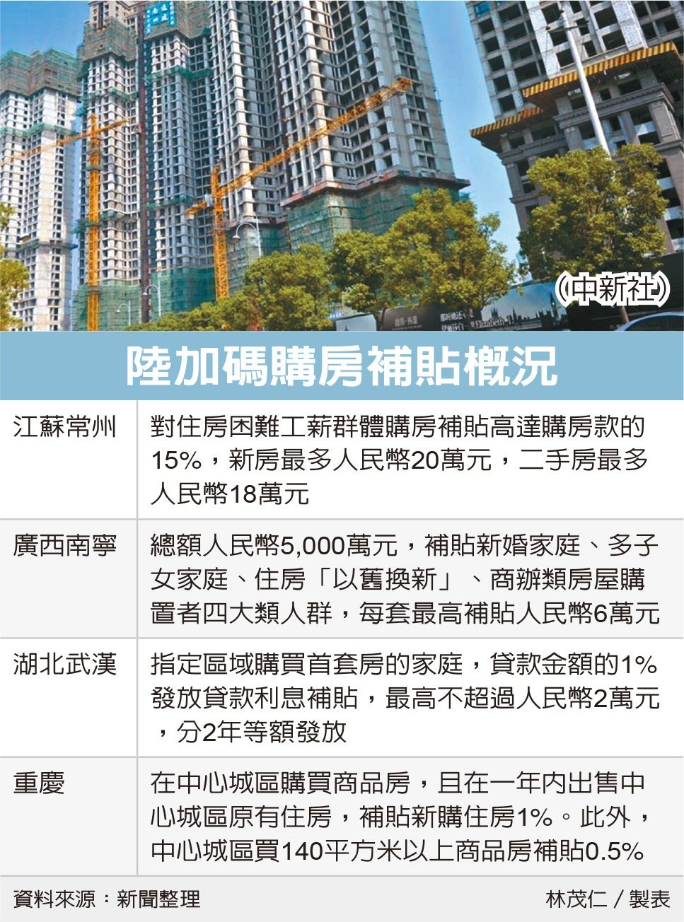 大陆多地密集加码购房补贴政策。根据房市调查机构中指研究院统计,今年9月以来就有江苏常州、湖北武汉、广西南宁等超过30个城市公布购房补贴相关政策,有地方甚至补贴购房款高达15%。