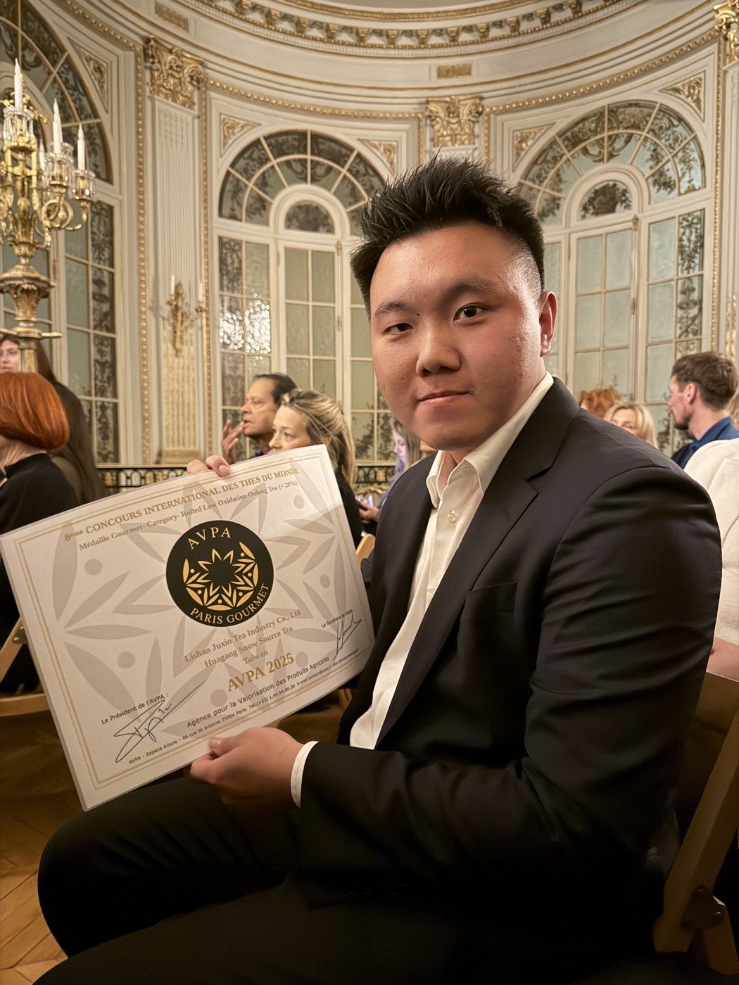 台中市梨山聚鑫制茶廠執行長謝忠霖日前到法國巴黎參加法國茶葉國際大賽,以「華崗雪源頭」茶葉榮獲大會頒特別獎,主辦單位介紹台灣時螢幕出現中華民國國旗,現場有中國大使館人員站起來嗆「台灣只是中國的一省」,主辦單位未理會繼續頒獎,成為國際賽事插曲。