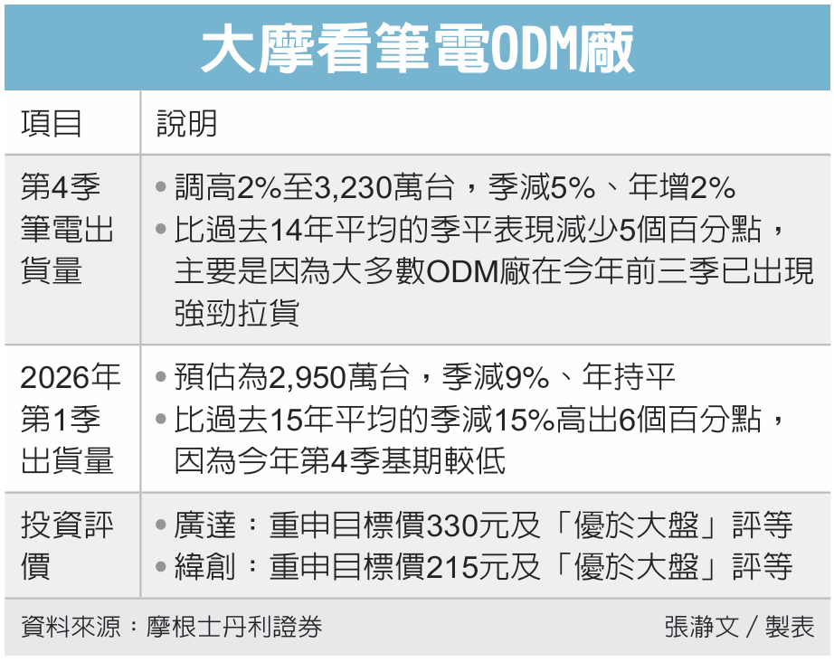 大摩接触部分ODM厂之后,上调第4季笔电整体出货量,反映年底建立库存的需求。部分个人电脑(PC)品牌厂正努力提供折扣给消费者,以提前锁定市占率,因为整体PC平均售价预期在2026 年将因为记忆体成本上升而提高。