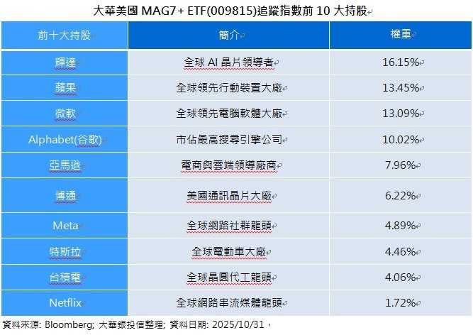 大华美国MAG7+ ETF追踪指数前10大持股。(资料来源: Bloomberg; 大华银投信整理)