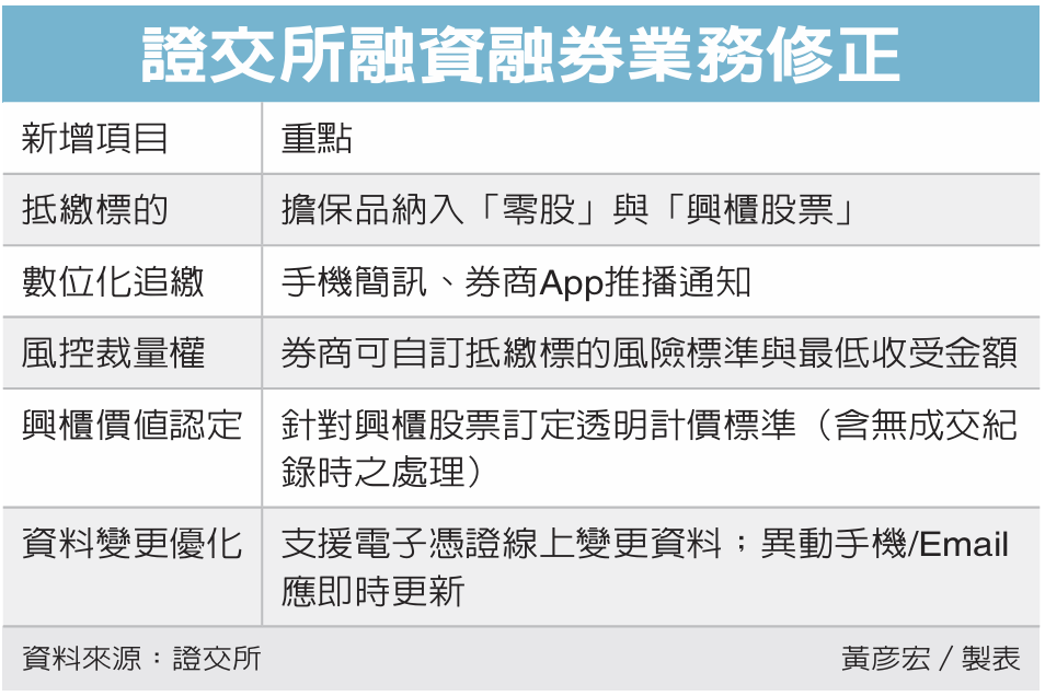 台湾证券交易所为进一步提升投资人资金调度弹性,并因应金融科技数位化趋势,公告修正「证券商办理有价证券买卖融资融券业务操作办法」部分条文,修正重点包含开放「零股」与「兴柜股票」作为抵缴担保品,并新增「手机简讯」与「App」等数位化追缴通知管道,相关制度将于今年3月30日实施。