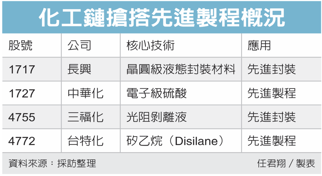 台积电(2330)、人工智慧(AI)继续成为市场焦点,供应链题材也受市场瞩目,法人点名,台系化工链业者抢搭先进制程、先进封装列车,今年预计将陆续导入晶圆代工大客户,因被视为具有「含积量」而受瞩目。