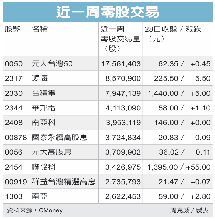 台股本周焦點在於美聯準會12月降息預期升溫、經濟數據憂喜參半等多空因素,行情震蕩走強,投資人逢低持續以零股進場卡位,其中鴻海(2317)等大型電子權值股、元大台灣50等ETF,為市場交投重心。