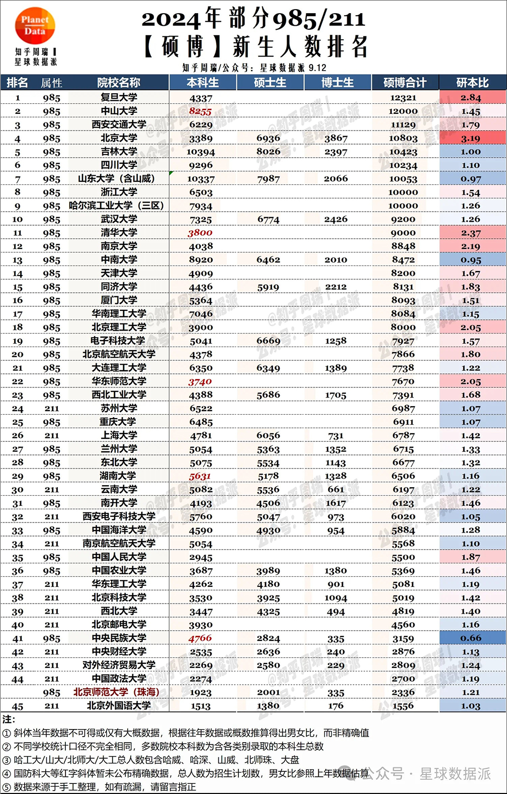 知乎用户周瑞、微信公众号\”星球数据派\”所整理的今年部分985/211高校新生研本比。(来自公众号\”星球数据派\”)