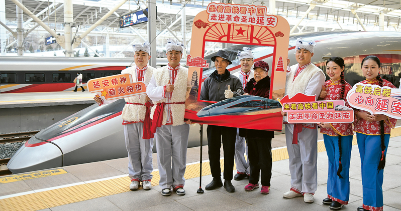 西延高铁首班列车C9309次复兴号智能动车组昨上午10时从延安站出发。 西延高铁线路全长299公里,设计时速350公里,是目前穿越黄土高原设计时速最高的铁路,也是“八纵八横”高铁网包头、银川至海口的包(银)海通道的重要组成部分。 新华社报道,延安市经济合作局副局长席建勇表示,西延高铁预计带动延安每年接待游客突破5000万人次,帮助苹果、小米等土特产走出去,让“科研在西安、生产在延安”有望成为现实。