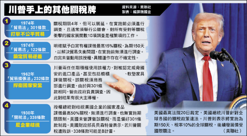 美国联邦最高法院裁定总统川普无权以国际紧急经济权力法(IEEPA)实施全球性关税,川普旋即援用其他法源宣布对各国加征十%关税。 学者专家多认为,台湾政府、朝野千万不要误判情势,背弃已经谈好的条件,勿对美国食言风险最低。
