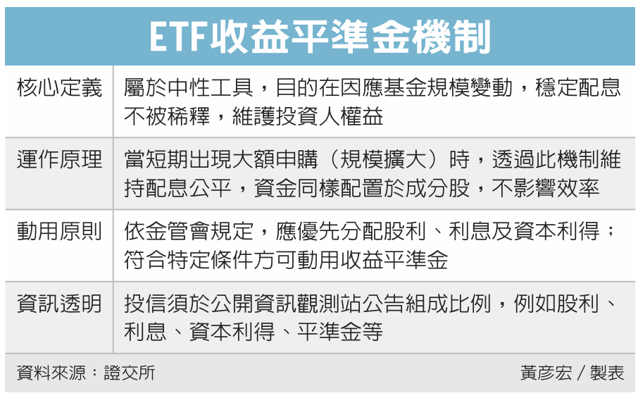 随著台湾ETF市场规模持续扩大,ETF的收益分配方式与组成来源,逐渐成为投资人关注的重要议题。收益平准金作为ETF配息制度的一环,为因应基金规模变动而设,属于中性工具。
