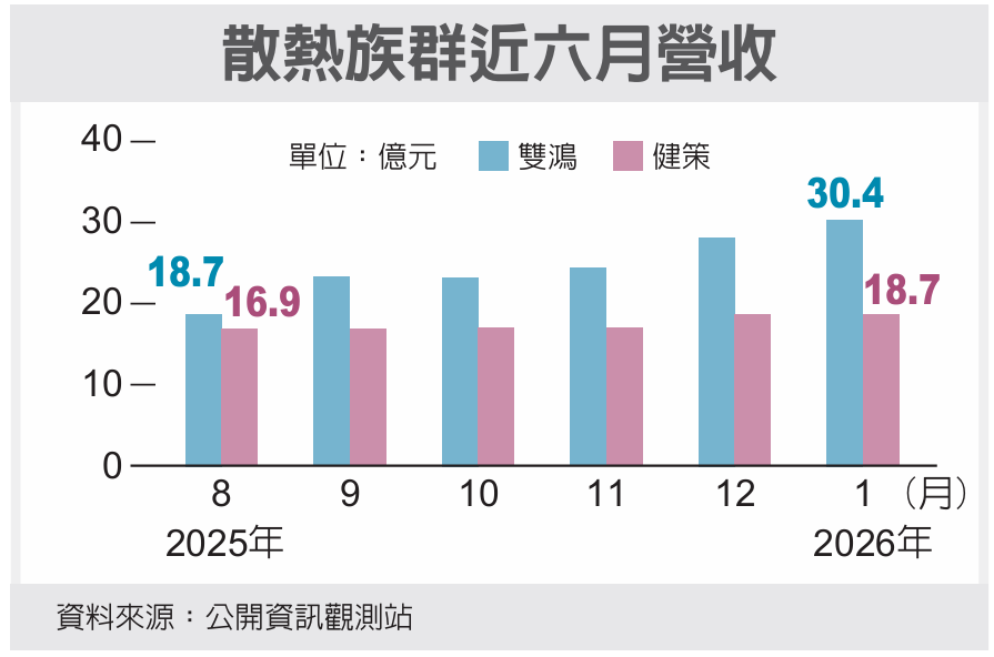 散热模组厂双鸿(3324)昨(6)日公布元月营收30.42元,月增7.8%,年增1.2倍,创历史新高;健策元月营收18.73亿元,月增0.1%,同步改写新猷,年增29.4%。