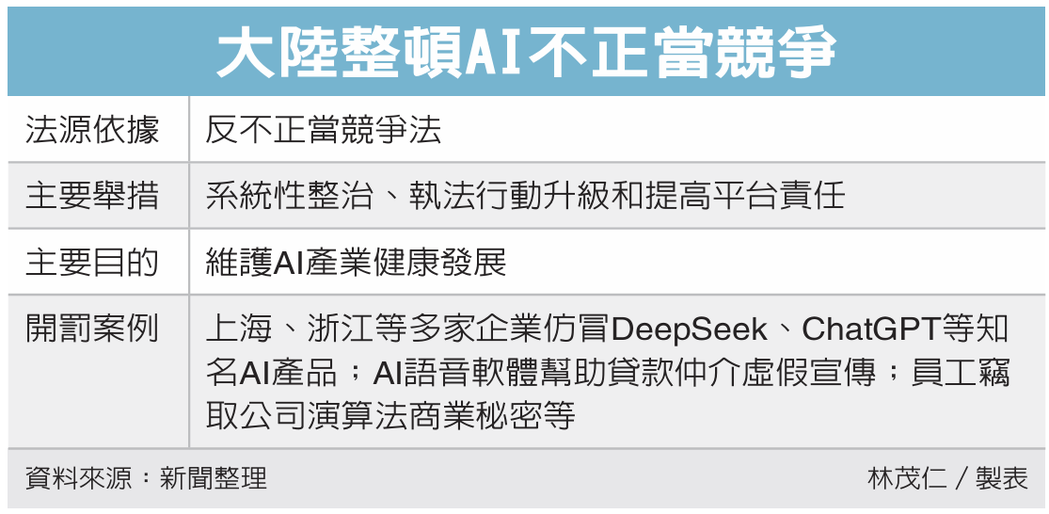 陆AI产业野蛮生长多年,衍生不少乱象,大陆新修订的「反不正当竞争法」在去年10月上路后,首度将AI引发的新型竞争问题纳入规范,近期透过系统性整治、执法行动升级和提高平台责任等举措,遏制AI技术滥用乱象。