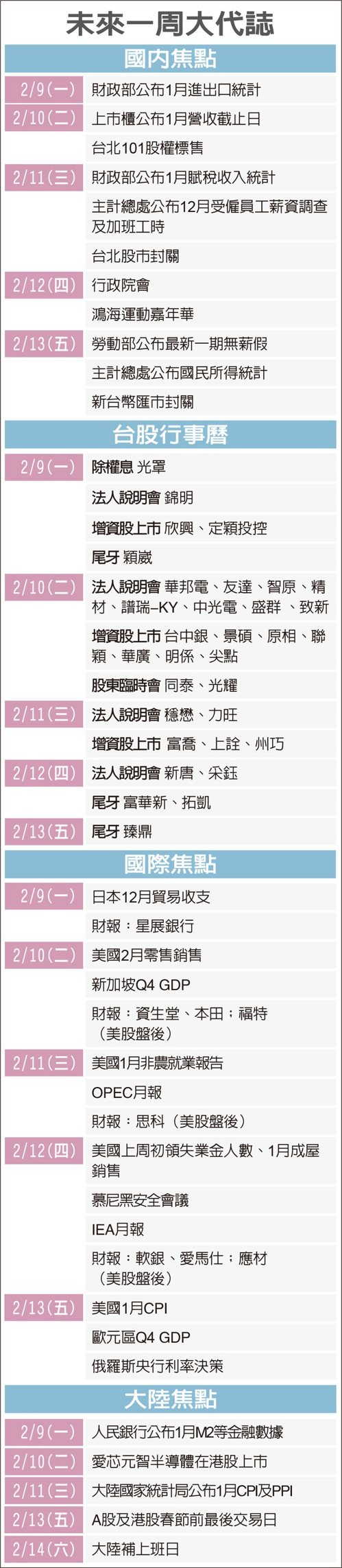 经济日报新闻部每周整理《未来一周大代志》,包括国内、国际和两岸焦点,也提供台股行事历,让读者了解未来一周值得关注的重要财经事件。 🔗 您可能感兴趣的内容:0301 未来一周大代志0222 未来一周大代志0201 未来一周大代志0125 未来一周大代志0111 未来一周大代志0104 未来一周大代志1228 未来一周大代志1221 未来一周大代志