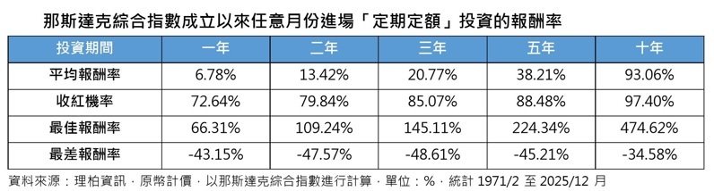 那斯达克综合指数成立以来任意月份进场「定期定额」投资的报酬率。(资料来源:理柏资...