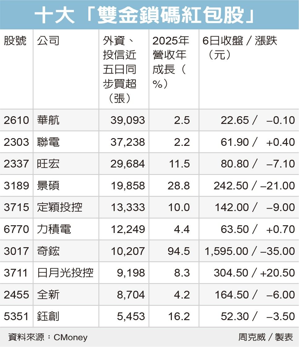 根据统计,外资、投信二者在近五日同步买超、且合计张数逾5,000张,在基本面、筹码面同步呈现优势的锁码股,包括华航、联电、旺宏、景硕、定颖投控、力积电、奇鋐、日月光投控、全新、钰创等十档「双金锁码红包股」,是投资人逢回布局的好标的。