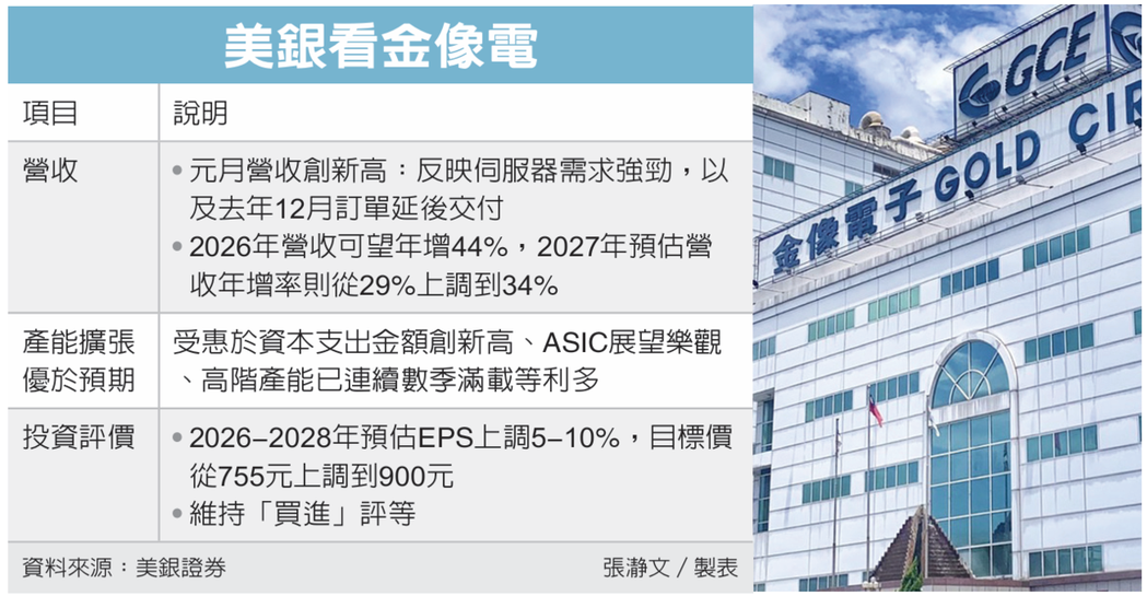 金像电元月营收为60.16亿元创历史新高。美银指出,这已占第1季美银所预估营收的35%,反映伺服器需求强劲,以及去年12月订单延后交付。美银预估金像电2月营收月减约15%,反映农历新年假期及1月基期高,但3月营收预估月增约15%,第1季营收预估季增4%、年增41%。