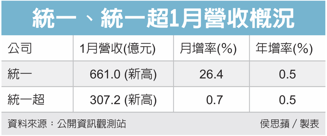 统一企业集团旗下统一(1216)、统一超昨(10)日都公布1月营收,两家单月营收同创历史新高纪录,其中,统一元月营收661亿元,较上月跳升逾两成、年增0.5%;统一超单月营收达307.2亿元,年增0.5%。