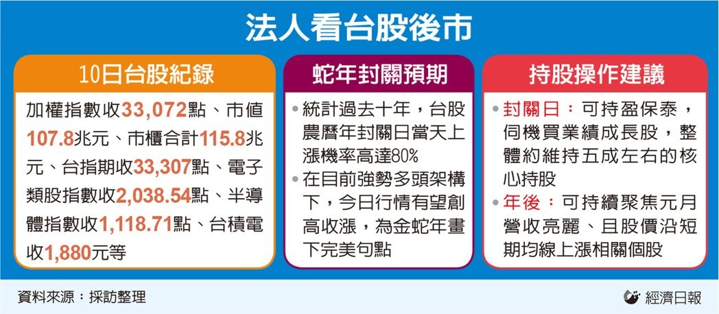 台股今日迎来金蛇年封关日,统计至昨日,蛇年累计涨点已达9,547点,逼近万点。综合凯基投顾董事长朱晏民、富邦投顾董事长陈奕光、台新投顾副总黄文清等观点,统计过去十年台股农历封关日当天的上涨机率高达80%,在目前台股强势多头架构下,今日行情有望创高收涨,为金蛇年画下完美句点;而首季结束前,指数将朝向35,000点进军。