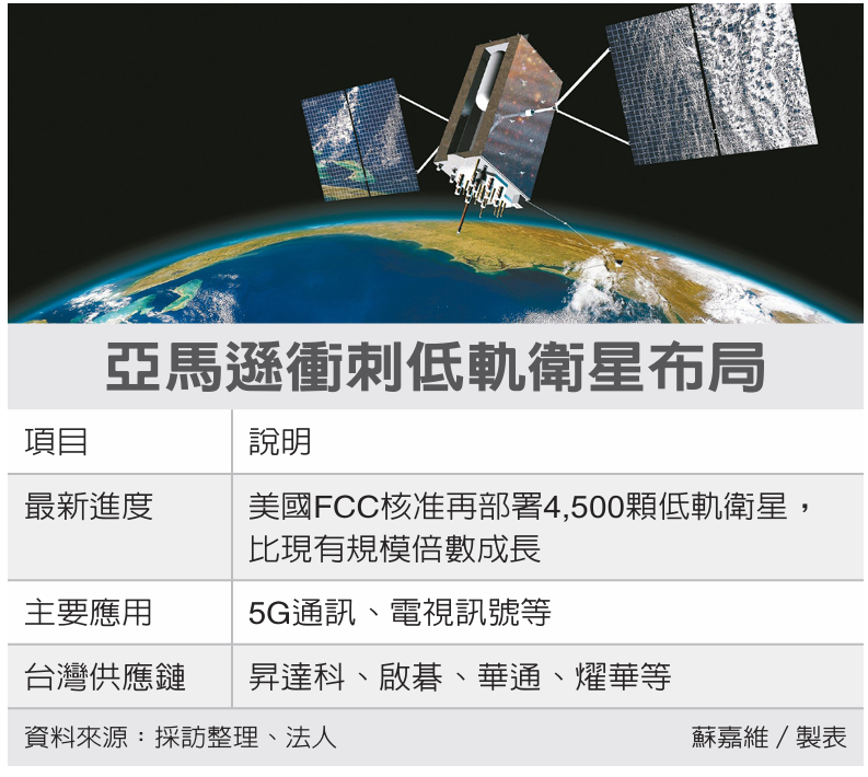 美国联邦传播委员会(FCC)10日宣布,核准亚马逊再部署4,500颗低轨卫星,比亚马逊现有低轨卫星规模倍增。法人看好,亚马逊低轨卫星布局迈大步,这次获准部署数量倍增,升达科(3491)、华通、燿华、仲琦等台湾协力厂订单可望同步翻倍。