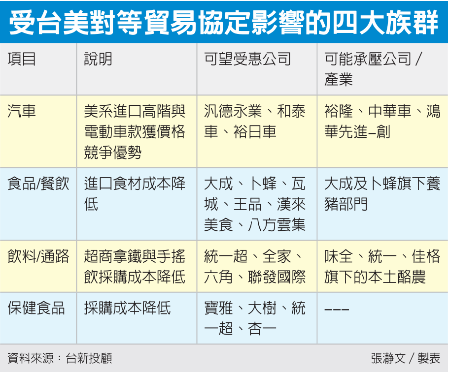 至于在进口关税部分,对肉食品来说,受惠成本降低的有大成(1210)、卜蜂等,餐饮的王品、汉来美食、瓦城、八方云集等;汽车通路商泛德永业、和泰车、裕日车等可从美国进口汽车业者;受惠美系保健食品等采购成本降低的宝雅、大树、统一超、全家、杏一等等,也属利多。