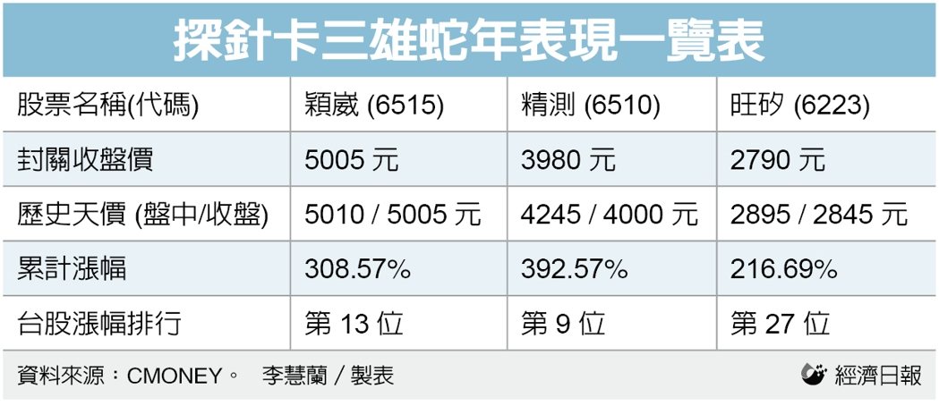 台股新贵族!颖崴登5,000元股后 一表看懂探针卡三雄蛇年谁最猛?