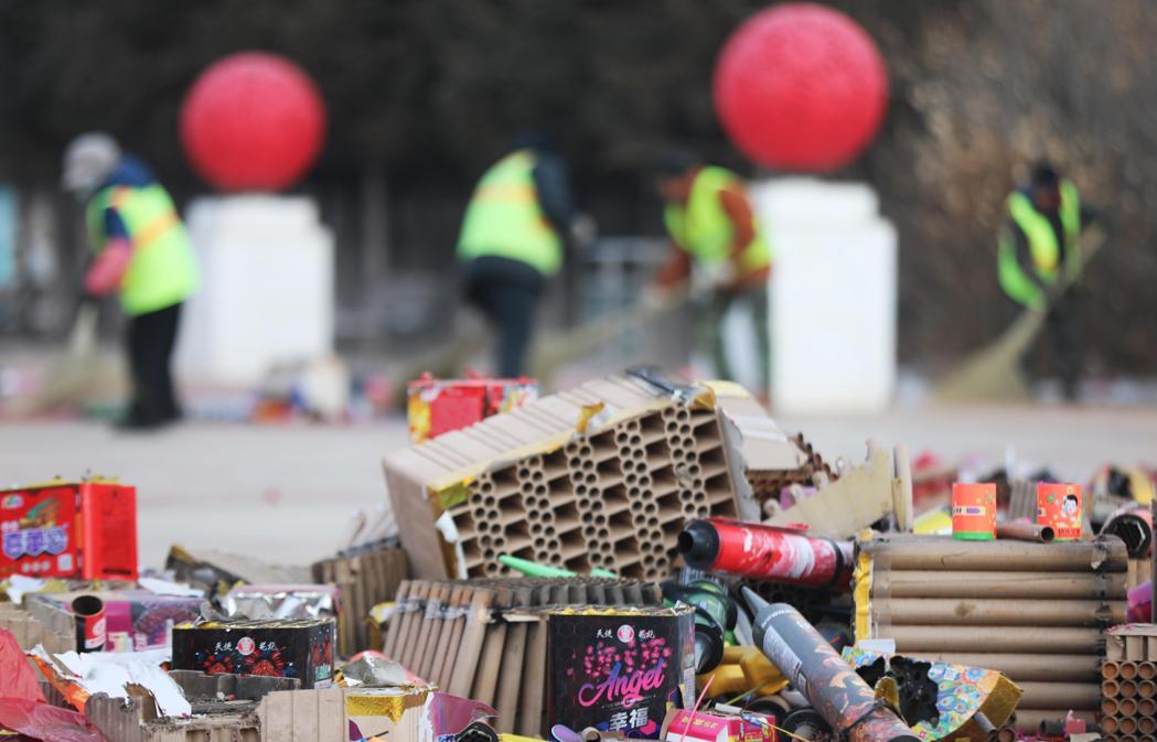 湖北宜城发生烟花爆竹销售店爆炸事故。图为黑龙江省齐齐哈尔市某街道上燃放鞭炮后的残余碎屑。(新华社)