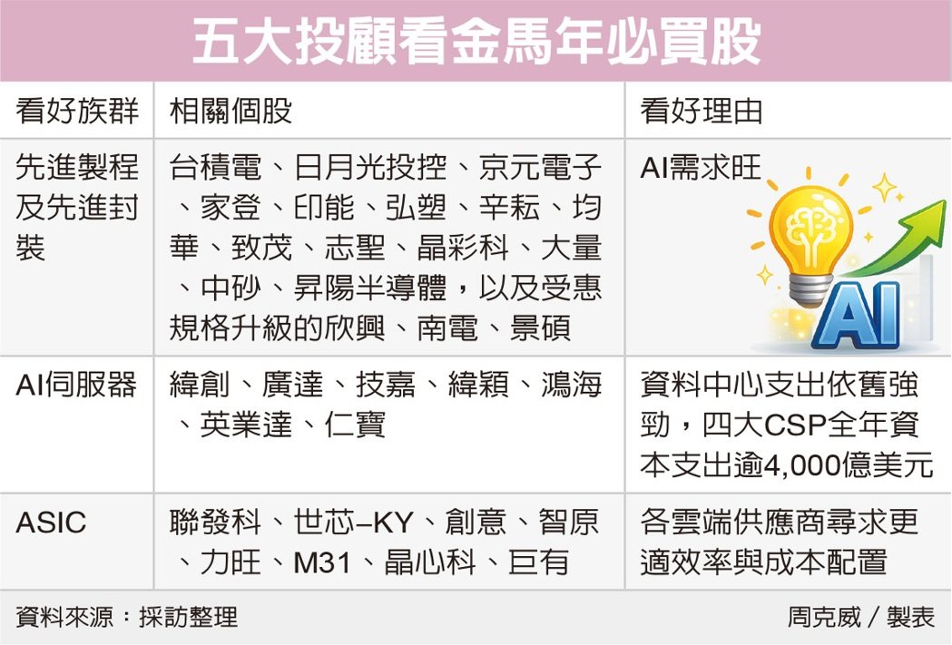 台股金马年受惠AI强劲需求,法人圈陆续上调今年上市柜公司获利至5.4兆元,指数高点最高上看39,000点后,凯基、富邦、台新、统一、永丰五大投顾,看好先进制程及先进封装、ASIC、AI伺服器三大族群后市表现。
