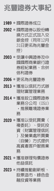 为使业务更加多元,兆丰证券2013年跨足财富管理业务商机、2014年获准设立国际证券业务分公司(OSU)、2020年开办高资产客户服务业务、2021年第4季获准办理有价证券他益信托业务等。