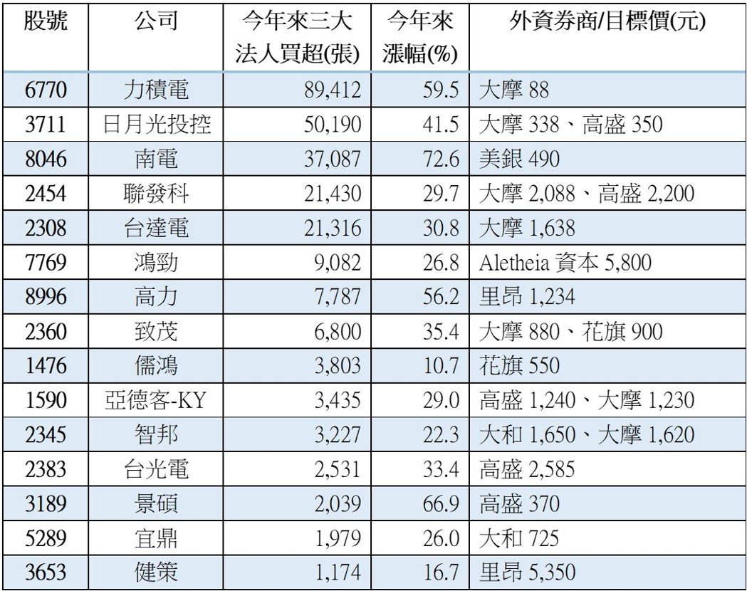 随AI供应链多元扩张,由外资点金的「悍马猎杀股」来势汹汹,观察2月以来外资法人发布的最新报告中,不仅获得「优于大盘」及「买进」评等,1月营收每股税后盈余(EPS)稳健、今年来三大法人买超千张以上、且股价涨幅达双位数的个股,包括:力积电、日月光投控、南电(8046)、联发科、台达电、鸿劲(7769)等,皆有望成为追捧焦点。