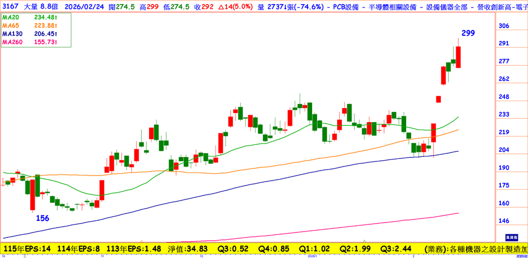随著辉达等大厂对AI晶片需求畅旺,晶圆代工厂正全速扩充CoWoS封装产线,大量的CMP Pad量测等半导体设备需求亦随之水涨船高,预期今年半导体业务将随客户扩产步伐实现倍数级别的强劲成长。今年1月营收6.01亿,月增7.53%、年增119.57%,写历年单月新高,主要受惠于高阶CCD背钻机出货持续提升及扩厂效益,预期Q1淡季不淡,全年营收有机会挑战高双位数成长、续创新高,今年估要赚14元,值得期待。