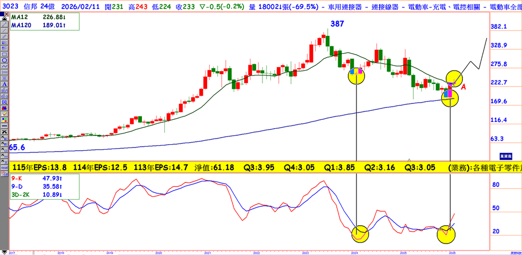 人形机器人黄仁勋在被背板上的机器人公司很多都是信邦的客户,该公司出货线束、连接器、PCB,尤其线束技术要求高,特别是关节弯曲,产品需承受10万次以上弯曲,信邦的产品在这一方面发展已有成,信邦去年前三季EPS 10.06、估全年EPS 12.6,这是有实质基本面且超低本益比,元月营收28.07亿呈双增,在今年景气全面复苏,兼以半导体人型机器人耕耘有成,EPS可达约14.8股价只有239、本益比16.2倍严重低估,这是一档月KD刚交叉向上的全面走多股。