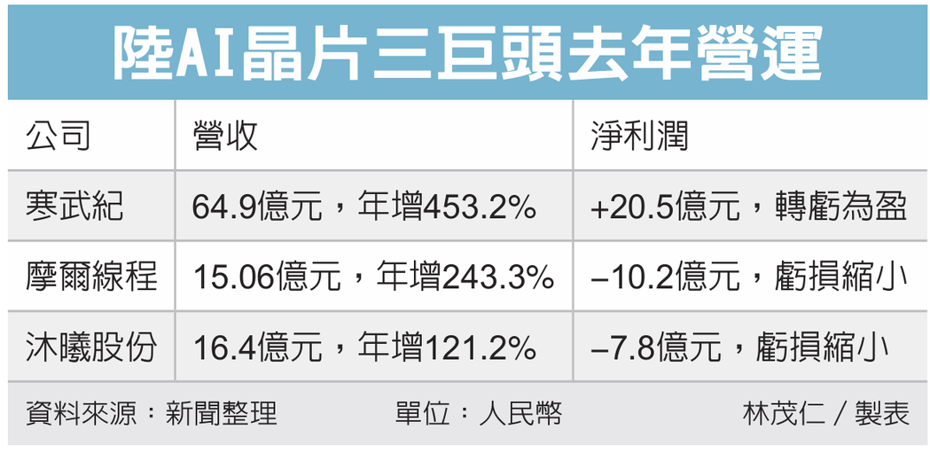 陆 AI 晶片巨头 寒武纪转盈 同业摩尔线程、沐曦股份亏损缩小