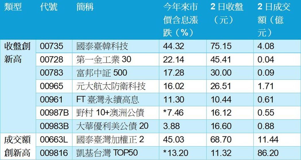 盘点盘面上ETF表现,在题材发酵下,2日共计有七档ETF收盘价创下成立来新高,包含国泰台韩科技、第一金工业30、富邦中证500、元大航太防卫科技、FT台湾永续高息、大华优利美公债20、野村10+澳洲公债,其中,今年来国泰台韩科技市价(含息)大涨44.32%、第一金工业30涨22.14%、富邦中证500涨17.28%、元大航太防卫科技涨16.02%,表现亮眼,惟须留意合理折溢价。