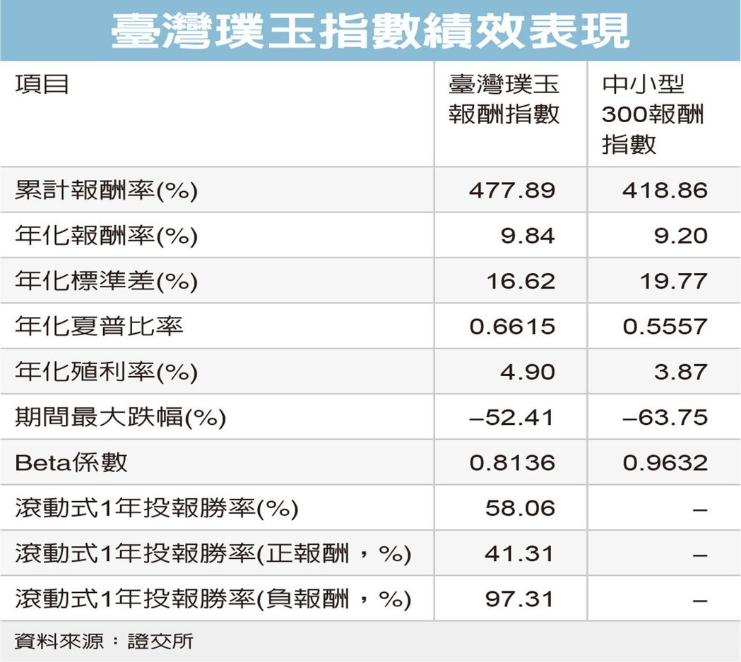 依据长达18年的历史资料模拟指数编制规则回溯,「台湾璞玉指数」整体报酬率、波动度及夏普值表现,皆优于表彰上市中小型股的「中小300代表指数」,显示兼具价值及品质特色之中小型股组合,长期投资绩效稳又好。