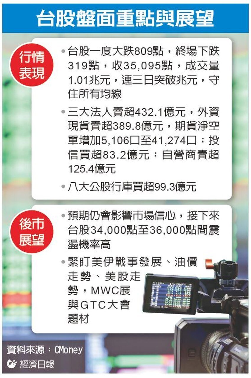 美伊开战冲击全球投资市场,台湾加权指数昨(2)日开盘一度大跌809点,但在国家队、投信等内资进场力挺下,台股上演V转秀,终场仅跌319点、跌幅0.9%,在亚股中相对抗震。法人指出,预期美伊战事仍会牵动市场信心,台股短线在34,000点至36,000点间震荡机率高。