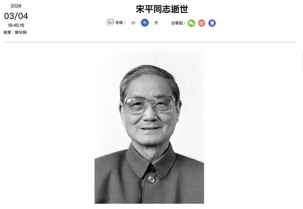 新华社报导表示,中共的优秀党员,久经考验的忠诚的共产主义战士,杰出的无产阶级革命家、政治家,中共党和国家的卓越领导人,中共第十三届中央政治局常委,原国务委员宋平同志,因病医治无效,于2026年3月4日15时36分在北京逝世,享年109岁。