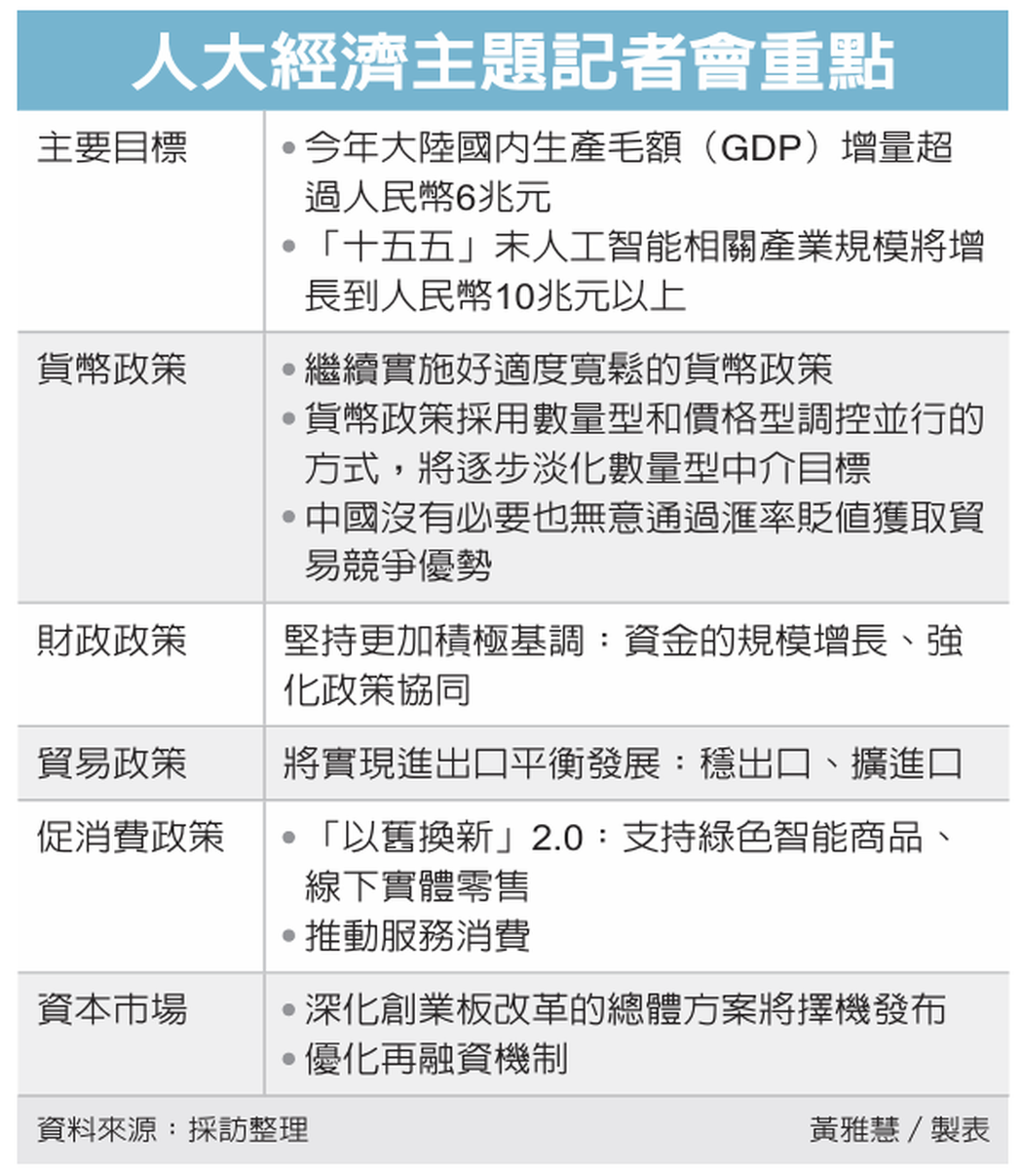 发展AI成为共识,而针对AI等高成长性工作需要政策支持,郑栅洁表示,将做好三方面工作:一是在集成电路、卫星互联网、国产大飞机、全国一体化算力网等领域,建设一批长链条、大体量的重大项目,投资规模都在千亿级甚至兆级;二是将会同财政部、人民银行等部门,再设立国家级并购基金,进一步畅通创业投资退出渠道,提高创投资本周转效率,预计引导撬动各类资金规模超人民币1兆元(约新台币4.6兆元);三是将推动软体开发、数据加工等无形资产可「入帐」、能「变现」。