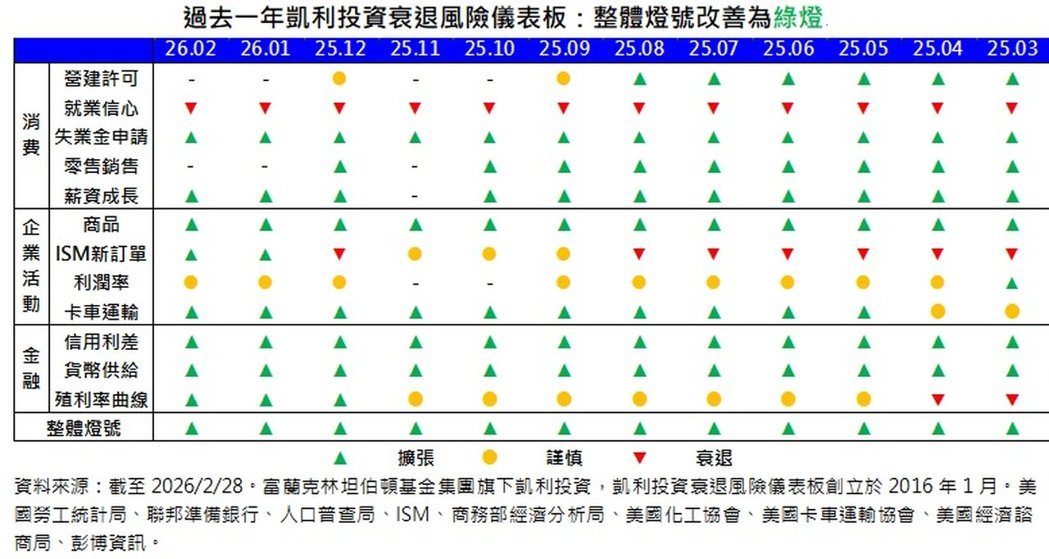 过去一年凯利投资衰退风险仪表板:整体灯号改善为绿灯。(资料来源:截至2026/2...