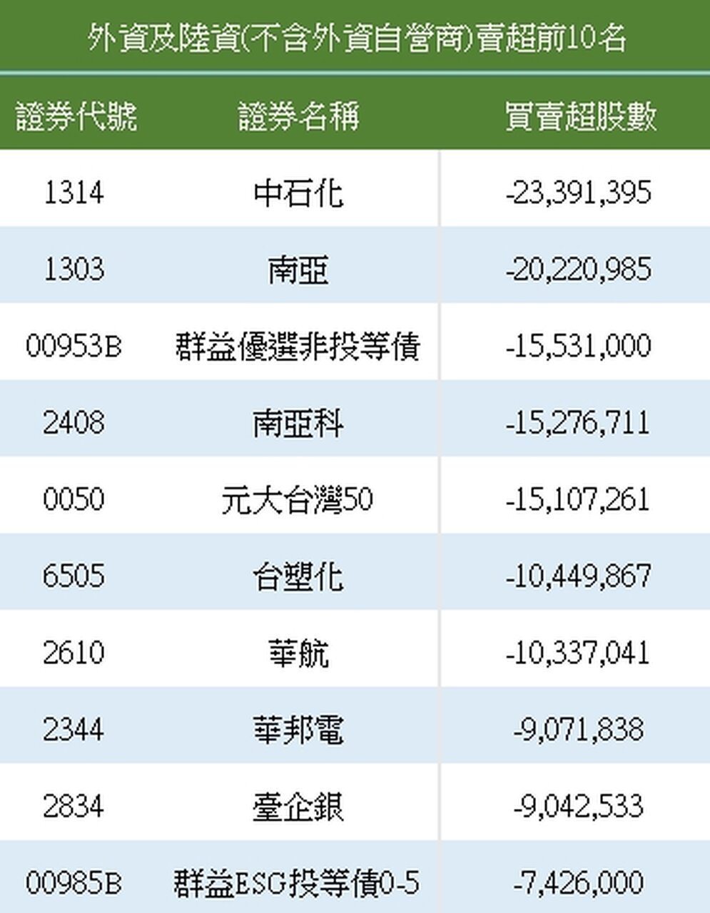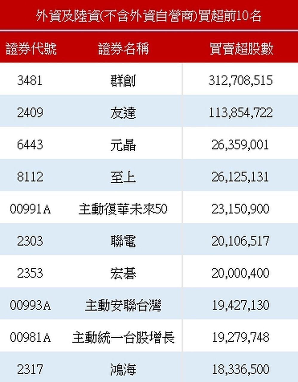 统计外资买超前十名个股发现,买超冠亚军都是面板股,群创挟著超额配息1元、处分厂房给南茂(8150)外,传群创成功夺下辉达(NVIDIA)与Google的光通讯关键元件Shuffle Box代工大单等题材,股价开高后飙上涨停30.3元锁死到收盘,成交量爆出112.8万张,外资单日大买31万2,709张;另外,台积电也获外资转为买超5,027张,终止连九卖。