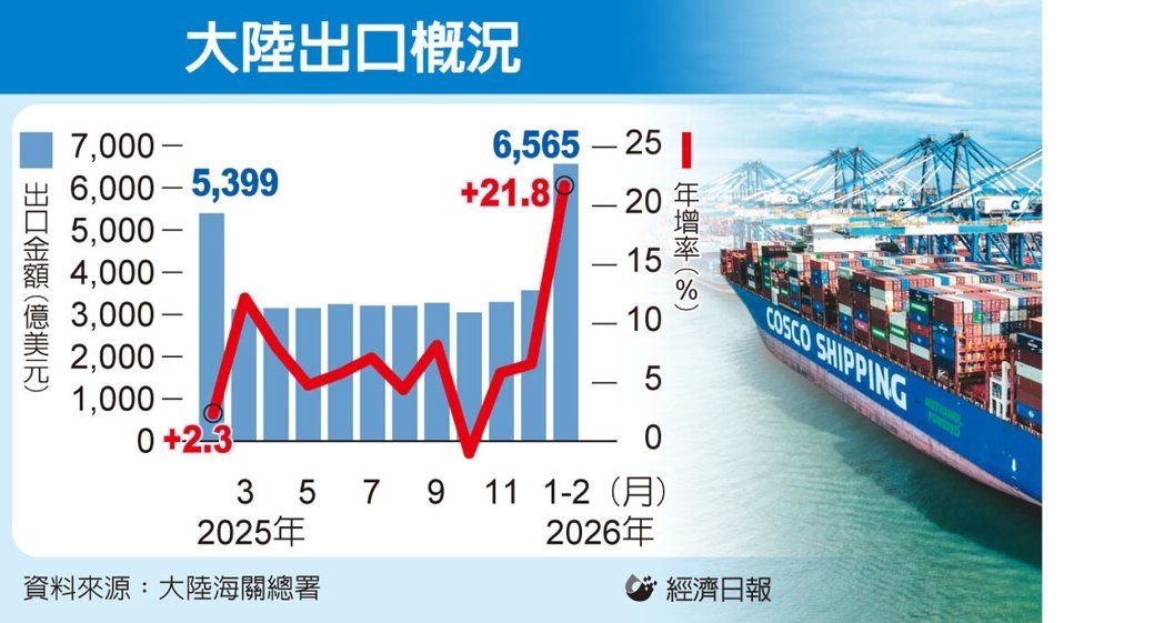 受强劲电子产品需求推动,大陆今年1-2月进出口年增率超过两成,远胜外界预期。分析师指出,未来几个月大陆出口增速可能会进一步走强,3月数据或将显示生产商加紧向美国出货,以利用最高法院的关税缓冲期。