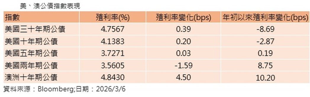 野村投信投资策略部副总楼克望表示,澳洲10年期公债是成熟国家主权债殖利率最高的债券,加上澳洲是目前全球少数拥有最高信用评等的国家之一,投资价值可见一斑。为了抑制通膨,澳洲央行2026年2月升息一码,是成熟国家中率先升息的国家,澳洲央行总裁Bullock 3月3日表示,不排除3月持续升息,使得澳洲10年期公债殖利率走高,截至3月6日,澳洲10年期公债殖利率来到4.8%的水准。