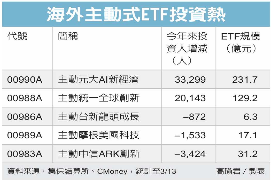近期受到中东战火、国际油价走高等影响,市场波动大,观察投资人对于五档海外主动式ETF偏好程度,统计至3月13日,主动元大AI新经济(00990A)今年来投资人数增加3.3万人、主动统一全球创新增加2.01万人。