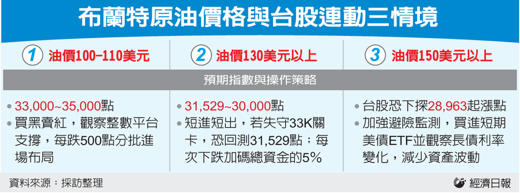 综合富邦投顾董事长陈奕光、凯基投顾董事长朱晏民、台新投顾总经理黄文清等看法,中东战事愈演愈烈,对台股影响有三大情境。首先,若油价维持在100~110美元,大盘预计在33,000至35,000点区间震荡;其次,油价升至130美元以上,指数区间恐下修至前波低点31,529点至30,000点整数关卡;第三是最糟糕情况,一旦油价飙破150美元,指数需提防回测28,963点起涨点的风险。