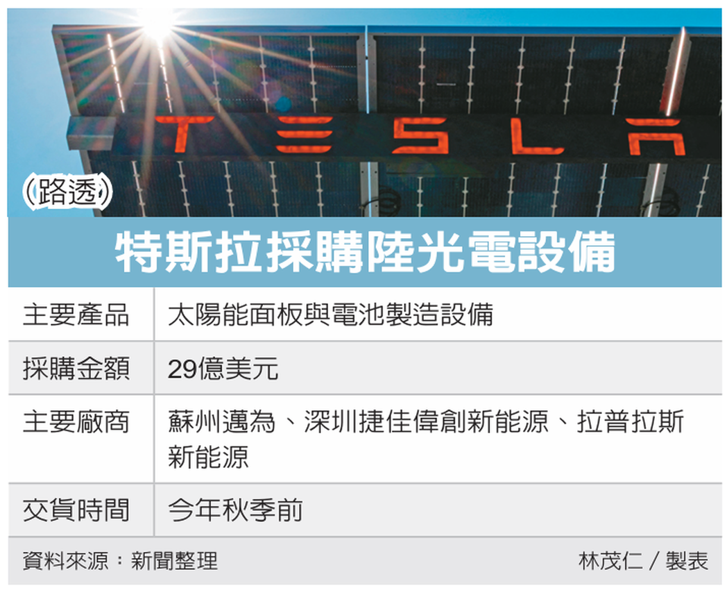 特斯拉正寻求向苏州迈为等中国大陆供应商,采购价值29亿美元(约新台币928亿元)的太阳能面板与电池制造设备,以达成执行长马斯克要扩增美国太阳能容量100百万瓩(GW)的目标。