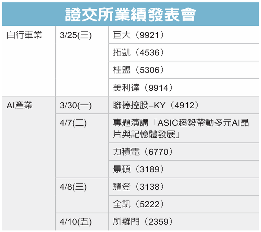 台湾证券交易所为协助投资人深入了解指标性企业的经营绩效与策略布局,推出系列「主题式业绩发表会」。活动聚焦当前市场两大核心引擎「AI产业」与「自行车产业」,邀请达明 (4585)、力积电、景硕等11家上市公司接力登场,展现台股坚实的产业韧性与成长潜力。