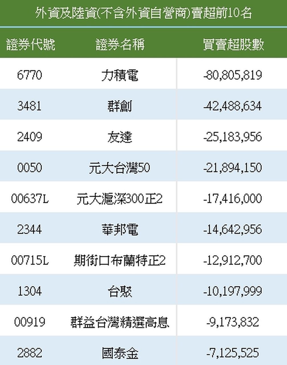 外资卖超前十名。 资料来源:证交所