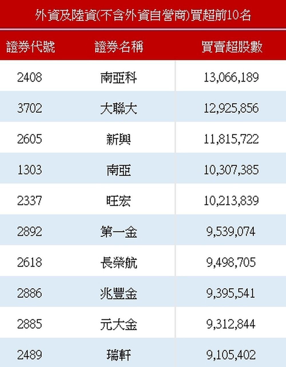 外资买超前十名。 资料来源:证交所