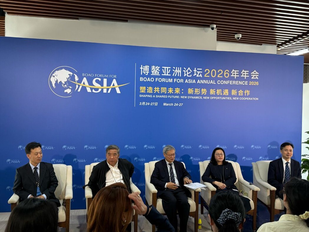 对于中东局势给中国经济带来的影响,对外经贸大学前副校长林桂军(左二)24日在博鳌论坛期间受访表示,虽然导致石油进口国衰退下降,经济下降,但同时中国新能源有很好的发展。记者黄雅慧/摄影