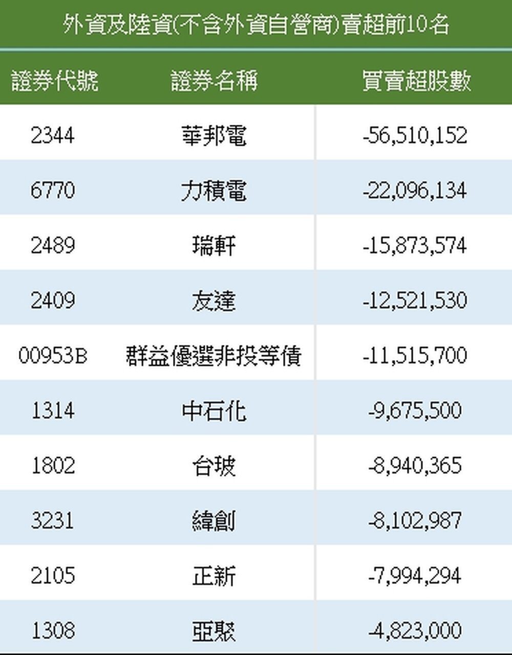 外资卖超前十名中,卖超华邦电56,510张最多,其次是卖超力积电(6770)22,096张,友达(2409)、纬创(3231)、台玻(1802)也遭外资大卖。