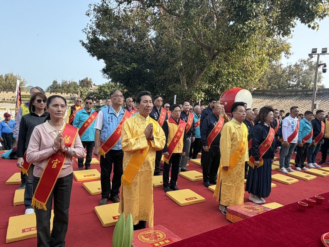 金门各界组团赴大陆关帝庙宗教交流团,22日于东山岛黄道周石雕广场举行联合献敬大典,金门县长陈福海与县议会议长洪允典带领信众祈福祭拜。记者蔡家蓁/摄影
