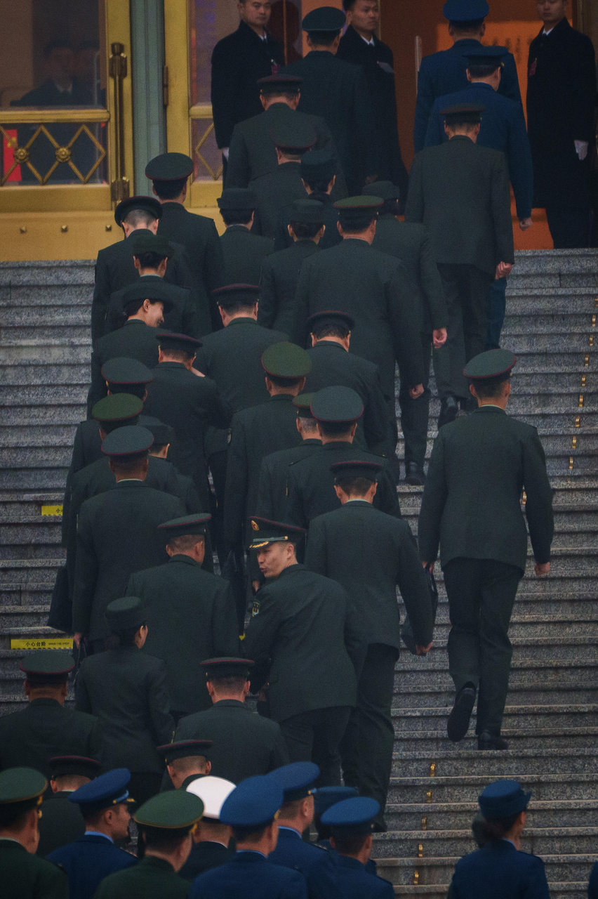 中国大陆众多军方高层与军工领域专家近期接连落马引发关注。图为今年3月4日解放军代表团抵达北京人民大会堂,准备参加全国人民代表大会预备会议。(美联社)