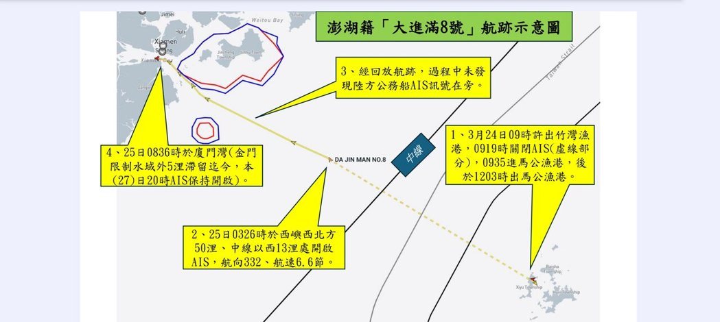 澎湖籍渔船「大进满8号」4天前涉嫌非法向大陆渔船贩卖成品油被大陆海警扣押。图为「大进满8号」海上航行轨迹图。记者廖炳棋/翻摄