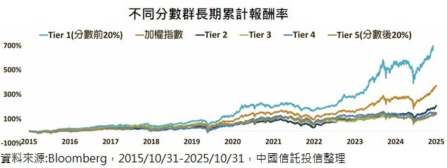 不同分数群长期累计报酬率(资料来源:Bloomberg)